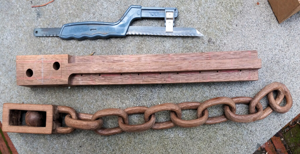 The final step is to use your knife and gouges to finish the chain and ball. But by now, a lot of wood has been removed and time saved.
