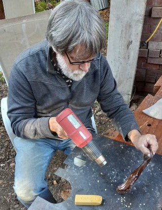 Shared on Zoom: pictures of Jim Planting melting “hard” Carnauba wax with a heat gun which also heats the wood for deeper penetration. And, the hot liquid wax also penetrates deeper providing a harder, sturdier, longer lasting finish.