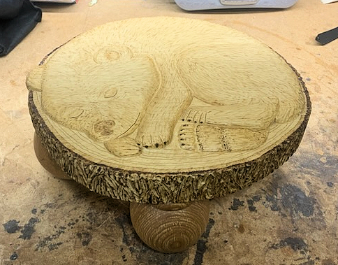Dan Roth, has finished his “Sleeping Bear Cub Stool”. The stool’s intended for his new grandson, less then 12 months, so it’s only about 6 inches high and about 12 inches in diameter. This is his second stool. The first was for his granddaughter and instead of a bear, she received a Lady Bug Stool. I think she’s about 3-4 now and uses the stool all the time. Dan hopes his new grandson will do the same with his.