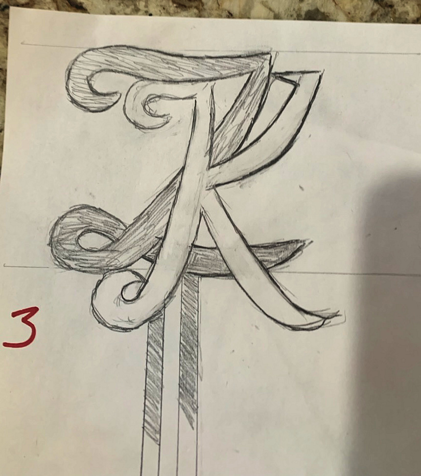 Ken Morgan (Below) showing his “Interlocking Love Spoons” diagram for a new set of Love Spoons. Ken, makes about 2-5 of these a year; as they are commissioned pieces. People use them for Anniversaries, Weddings, and other significant events. The spoons are 2 letters, usually the first letters in the first names of the recipients. The spoons are made of 2 different woods, usually a light and dark wood, and are designed to overlap each other through channels cut into each spoon (thus they interlock). They are displayed in a box (which Ken makes) which is covered with a colored cloth, beneath which is a foam form with precise recesses for the spoons to fix snuggly into. The spoons are about 10-12 inches.